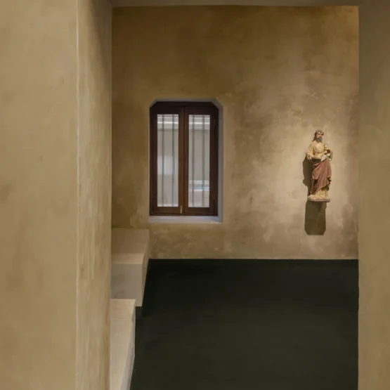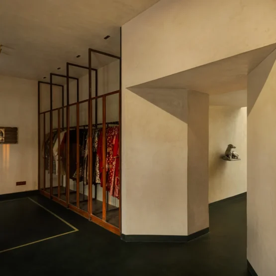 Long regarded as a city where art, politics, literature and design run through its very bylanes, Kolkata offers a natural extension of Raw Mango’s store after its flagship entry in Delhi. In the Ballygunge area, housed within an early 20th-century Art Deco building, the store’s appearance is rooted in Kolkata’s architectural memory while being gently rearticulated for the present—details that quickly recall when the city began transitioning away from ornate colonial styles towards cleaner, functional forms. Even inside sculptural elements created in collaboration with artisans known for Durga Puja installations further root the space within Kolkata’s visual and cultural memory. As one approaches the symmetrical, sun-washed white façade of Raw Mango, light and shadow take centre stage, while subtle Art Deco notes appear in the stepped parapet, linear grooves, and curved balcony edges. Wooden shutters add warmth and texture, contrasting with the minimal plastered surface. Here, the brand’s vocabulary unfolds not just through sarees and garments, but through intentionally crafted ‘pauses’ such as objects and spaces that move beyond the intention of a ‘transaction’. Conceived as an adda, the 4,800-square-foot building’s original asymmetries haven’t been concealed; instead, they are embraced. Floors, furniture, and lighting follow the structure’s inherent geometry, allowing the space to reveal itself gradually. This quite resistance to polish or ornate-ness mirrors the handloom itself, where plurality, imperfection, and variation are intrinsic to the craft. The interiors allow textiles to take precedence with garments housed in muslin-lined almirahs alongside carefully placed antiques. The absence of mannequins, posters, or overt branding allows the garments to exist without prescription, encouraging personal interpretation.  The attention paid to every corner of the store—down to the switchboards, hangers, fixtures, and furniture, all designed in-house—signals a shift in how brands approach retail today. Storytelling is no longer confined to products alone; it is embedded into the very infrastructure of the space, allowing visitors to intuitively grasp the DNA of what they are buying. In this model, time spent within the store matters as much as money spent. Moreover, having built a strong identity over the year, the label finds a common ground with the city’s lived memoir, shaping its physical presence in resonance with them.