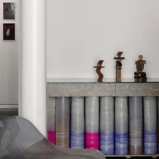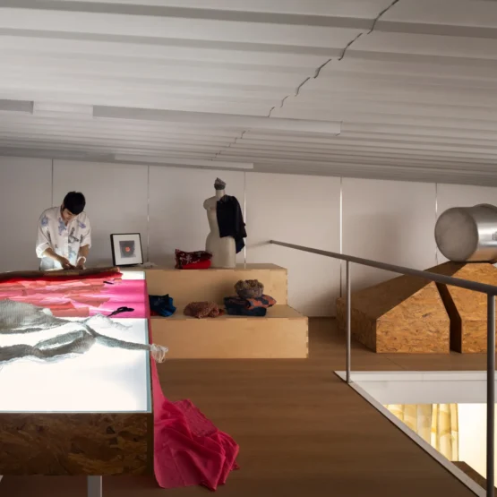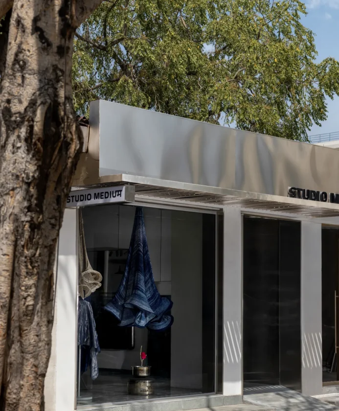 Located in Delhi’s Dhan Mill compound, Studio Medium marks the brand’s first flagship store. Known for its hands-free saris with precisely placed armholes and vivid gradient dyes, the space was designed not simply to showcase clothing, but to embody a fuller expression of the brand’s philosophy of experimental curiosity in materials, textiles, colours, and tradition. Located near the brand’s studio, the former warehouse’s raw structure is what initially drew the founders, Riddhi Jain Satija and Dhruv Satija, to the space. Refurbished by Gaurav Kothari, founder of the Chennai-based architecture studio Whitedge, much of its original character remains intact, with exposed walls, lofty ceilings, slender columns, and mottled flooring. Throughout its design, layout, and curation, the label now brings equal focus to quieter explorations, including textile installations, upholstery, and materials crafted from pre-consumer thread waste in its store. From the very entrance, there’s a deliberate nod to steel, a material central to every Indian kitchen. The branding on the storefront is set against a brushed metallic panel, and inside, the material appears subtly and unexpectedly: in the entrance console, the finish of the clothing racks, and a window display featuring an installation of stacked vessels. One oversized ‘pateela’ rests atop a sculptural triangle on the mezzanine floor beside a softly lit table draped in dyed fabric, allowing visitors to touch and feel the textiles. Throughout the store, while steel makes sporadic yet intentional appearances, as the eye moves beyond these metallic cues, textiles begin to take centre stage, treated not just as materials but as art. Meant to initiate a dialogue with metal, these two elements together invite visitors to explore the tension between the machine-made and the handmade, the industrial and the intimate. In the window, two suspended textile sculptures evoke the form of cocoons or unfolding blossoms. The overarching focus, however, is on repurposing. Beneath the staircase, this is evident in the statement couch, Terrasan seat, upholstered with fabric made from Studio Medium’s own thread waste, a table crafted from repurposed Arashi pipe legs, and the Dune Seat, created in collaboration with Hands & Minds, which anchors the space. Tucked between objects and textiles are framed works, including a painting by Pakistani artist Laiba Tanveer, reminding visitors that this space is shaped as much by process and practice as by product. At a time when most brand interactions unfold through screens, spaces like Studio Medium remind us of the irreplaceable depth that comes from experiencing a brand physically, not only through their collections but also through various other objects and interventions that expand the brand’s world.