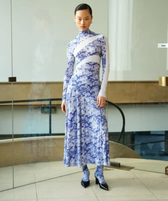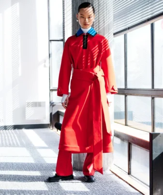 In more ways than one, the label continues to break from tradition, rejecting not only the notion that certain fabrics must be used in specific ways—pushing materials to their unexplored potential—but also challenging the idea of limiting oneself to a similar series of inspirations. Looking back at their early work, particularly the AW14 collection, even the Bauhaus aesthetic seems to have been a clear reference that is evident in the strong use of red, yellow, and blue, and the celebration of structure and construction. It’s interesting how such diverse sources of inspiration feed into their practice, and yet a “Miuniku piece” remains instantly recognisable. Complementing them are Miuniku’s campaigns, often shot in raw, minimal settings, featuring models posed in sharp, androgynous stances that mirror the brand’s own vision.