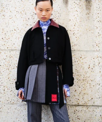 There’s much to be said about Miuniku’s elaborate approach to design, right from the silhouettes and colour palette to fabric and pattern–everything captivates from the very first glance. The precision of the cut, boxy coats, pleated skirts, and straight trousers feels almost architectural and remains unmissable. Another hallmark that runs through their collections is the brand’s masterful use of colour: primary hues that remain true to tone without ever feeling camp or over the top. Anchored in black, white, and tan, saturated blocks of cobalt, red, mint, and green create a sharp, striking contrast.